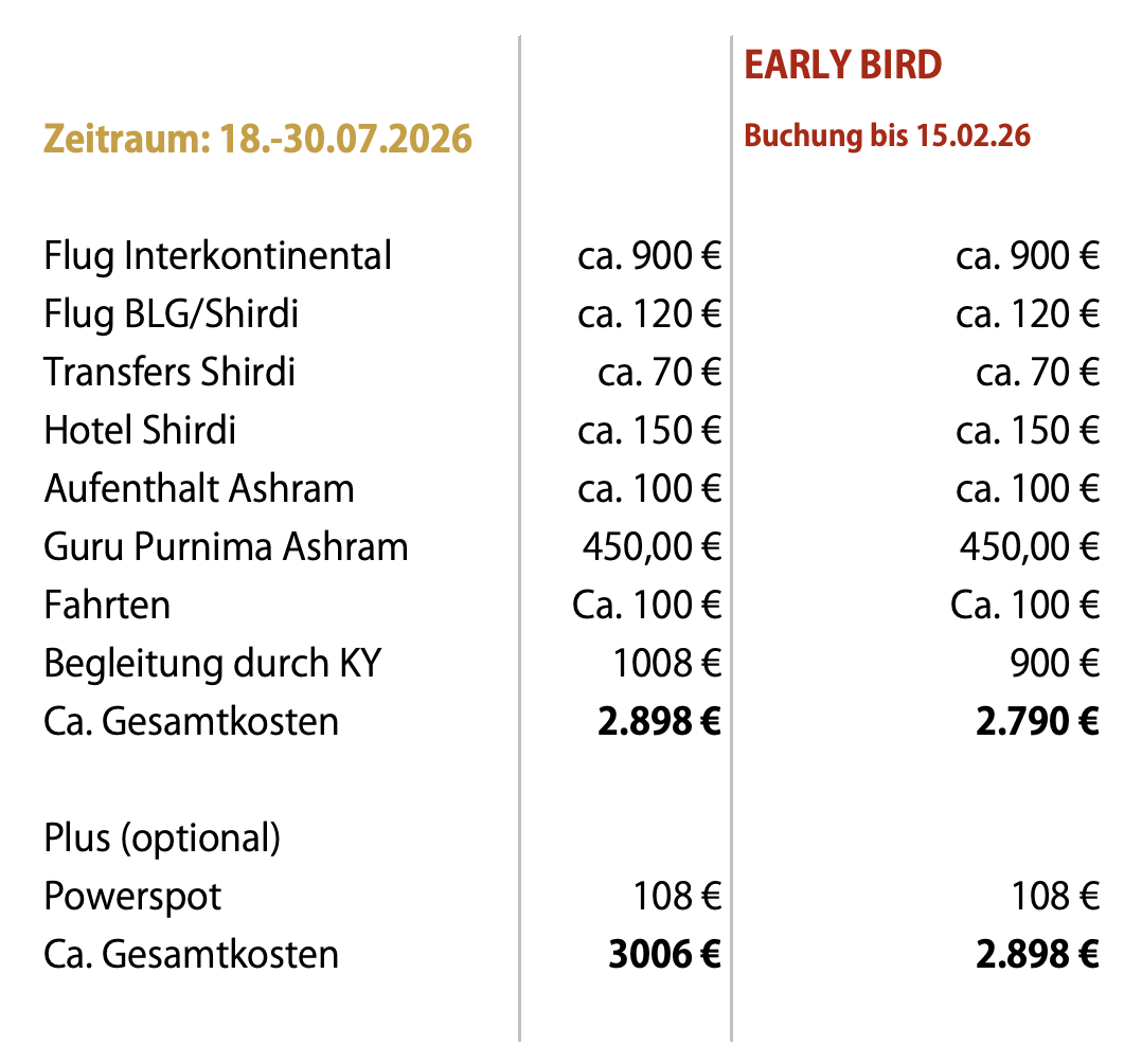 Deine Flüge, das Hotel in Shirdi und den Aufenthalt im Ashram buchst du selbst auf eigene Rechnung. Du erhältst mit deiner Anmeldung die Informationen & Links zum bevorzugten Emirates-Flug, den Link zur Reservierungsseite des Ashrams. Eine zeitnahe Buchung ist empfehlenswert, um günstige Flüge zu bekommen.